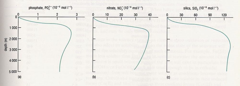 Biological uptakes Determins depth profile of nuitrients they are taken up in euphotic zone into the algal biomass. detritus sinks from the zone into the deep - no nutrient uptake below euphotic zone. however bacterial breakdown realses nutirents at depth and recycles them