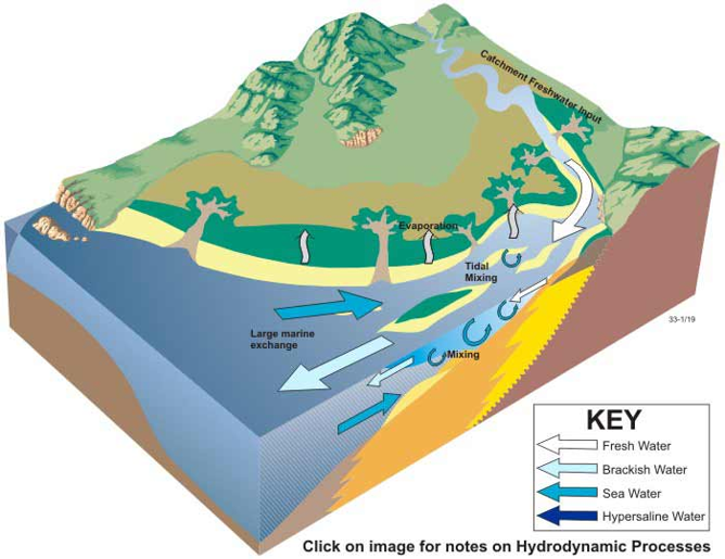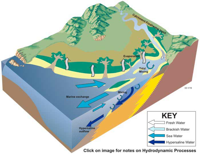 Flushing times these are important to understand - water exchange, flushing times of dissolved particles and ecology and management the longer the estuarine flushing time the more time avialable for processing - larger estauries with little river in put have long times