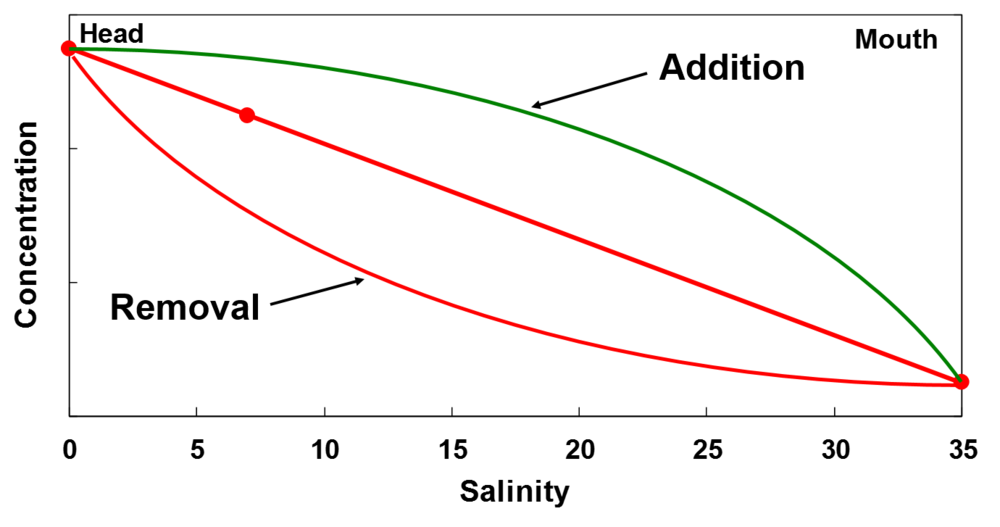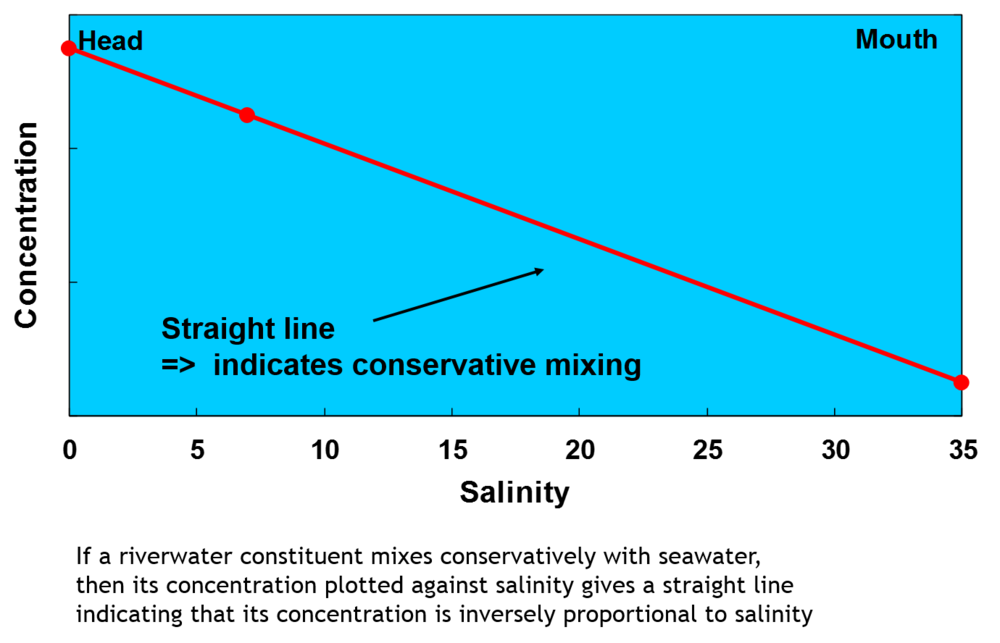 Estuarine mixing diagramuseful tool for identifying estuarine processes 2 components mixing diagrams assume the following -2 end member mixing - freshwater input dominant by one river mixes with the water from seawater three possible scenarios - conservative mixing -non-conservative removal or addition of water constituent