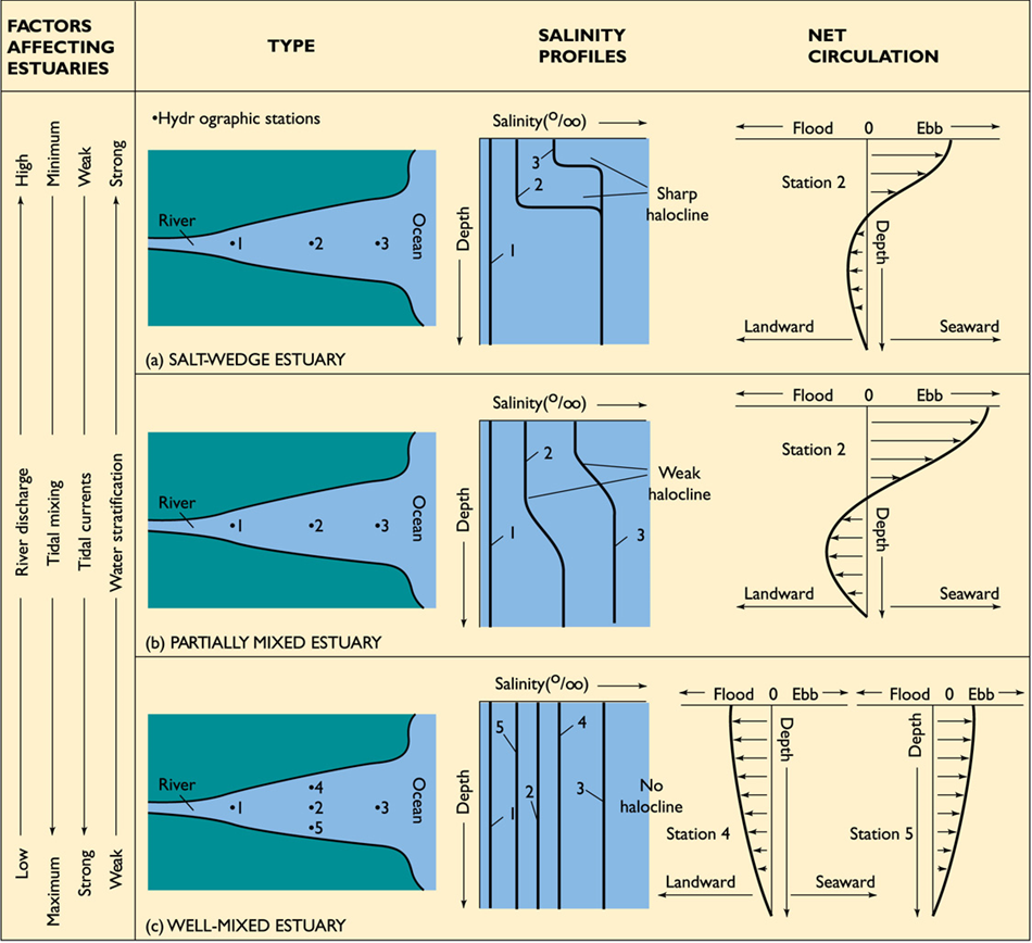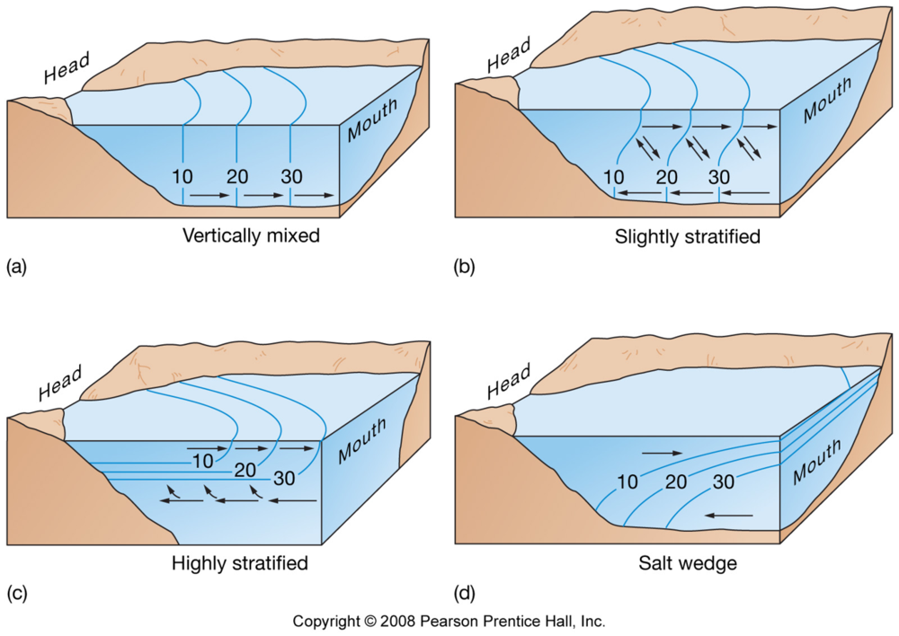 stratification and circulation these are interrelated -vertically mixed estuaries - surface and bottom layers always move in the same direction - only one that has water moving to river to sea at all depths -stratified and salt wedge -surface and bottom layers move in opposite directionaffected by -riverflow-tidal currents -morphology-bathymetry