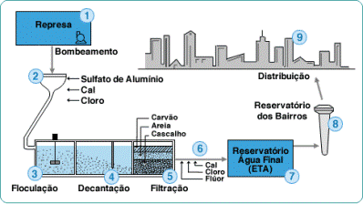 1º Captação de água: é captada de um rio, lago ou represa, por meio de uma adutora (conjunto de tubos).