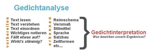 Eine Gedichtsanalyse untersucht Formalia des Werkes sowie Elemente wie Stilmittel, das Versmaß sowie Reimschemata. Das Gedicht wird dabei in die einzelnen Bestandteile zerlegt. Diese werden genau untersucht, sortiert und in irgendeiner Form bewertet. Anschließend daran interpretiert man dies. Die folgenden Folien sollen genauer anleiten, wie eine Gedichtsanalyse und die darin eingeschlossene Interpretation am besten zu vollziehen sind.