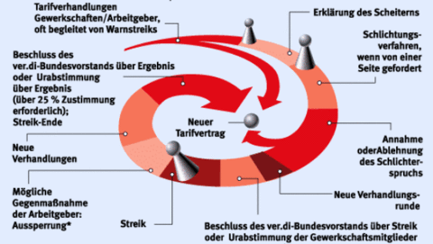 Die Schlichtungskommission im Schlichtungsverfahren besteht i.d.R. aus der jeweils gleichen Anzahl von Arbeitgeber- und Arbeitnehmervertretern plus einer neutralen Person.Urabstimmung Arbeitskampfmaßnahmen - mind. 75% der gewerkschaftlich organisierten Arbeitnehmer müssen dafür stimmenAussperrung: Kampfmittel der Arbeitgeber; planmäßige Ausschließung der Arbeitnehmer von der Arbeit unter Verweigerung der Lohnzahlung; Arbeitsverhältnis wird nur unterbrochenweitere Urabstimmung Streik-Ende - mind. 25% der Gewerkschaftsmitglieder müssen zustimmen