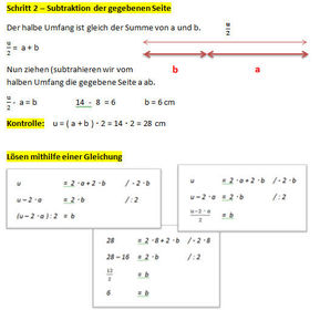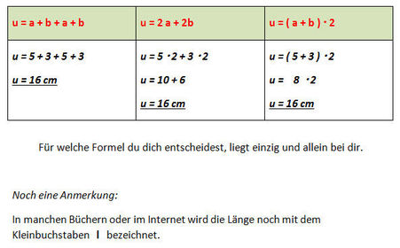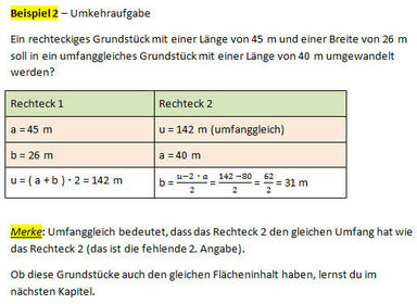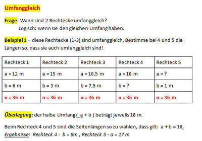 Zwei Rechtecke sind dann flächengleich, wenn sie den gleichen Flächeninhalt aufweisen!zum Beispiel:(1) a = 9 cm , b = 4cm; A = a . b = 36 cm²(2) a = 12 cm; b = 3 cm; A = a . b = 36 cm²Wenn zwei Rechtecke den gleichen Flächeninhalt aufweisen, müssen sie aber nicht den gleichen Umfang haben!!!(1) u = ( a + b ) . 2 = ( 9 + 4 ) . 2 = 26 cm(2) u = ( a + b ) . 2 = ( 12 + 3 ) . 2 = 30 cm