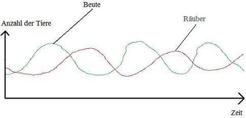 In einem Lebensraum befindet sich eine dominante Tierart (Räuber), die eine andere Tierart frisst (Beute). Man geht dabei davon aus, dass sich sich die Räuber primär von dieser einen Art Beute ernährt. Die Räuber und die Beute sind somit voneinander abhängig. Die Anzahl der Räuber steigt, wenn die Anzahl der Beutetiere hoch ist, da viel Nahrung für die Räuber zur Verfügung steht. Da sich die Anzahl der Räuber durch mehr Nahrung vergrößert wird immer mehr Beute gejagt und der Bestand der Beute sinkt. Da nun weniger Beute verbleibt,  haben die Räuber weniger Nahrung und deren Bestand schrumpft. Durch weniger Räuber kann nun der Bestand der Beute wieder steigen.