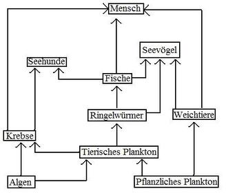 In der Natur ernähren sich bestimmte Lebewesen nicht nur von einer einzigen Art, sondern von vielen verschiedenen Arten von Tieren oder Pflanzen. Diese Art des "Fressen und gefressen werden" ist deutlich komplizierter als eine einfach Nahrungskette und wird daher als Nahrungsnetz bezeichnet. Am Beispiel Meer soll ein solches Nahrungsnetz einmal verdeutlicht werden. Wie die Grafik zeigt, werden zum Beispiel Algen von Krebsen gefressen. Und Menschen essen wiederum Krebse. Zu dem wird aber auch tierisches Plankton von Ringelwürmern gefressen.