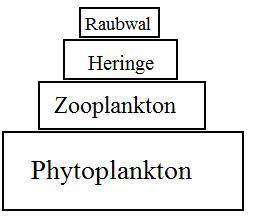 Bei einer Nahrungspyramide versucht man die Menge der Nahrung in einer Übersicht zu zeigen. Um dies zu demonstrieren sehen wir uns eine Nahrungspyramide am Beispiel des Meeres einmal kurz an. Ganz oben bei der Nahrungspyramide steht zum Beispiel ein Raubwahl, der die eine Ebene tiefer liegenden Heringe frisst. Die Heringe wiederum fressen Zooplankton, welche wiederum Phytoplankton fressen. Dabei steigt die Anzahl der gefressenen Tiere zum unteren Ende der Pyramide stark an. So frisst ein Raubwahl deutlich weniger Heringe als Phytoplankton von Zooplankton gefressen wird.