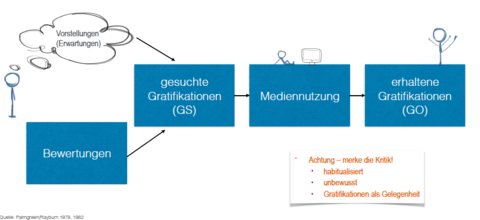 Kognitive Bedürfnisse:Informationsbedürfnis, Wissen (Nachrichten)Affektive Bedürfnisse:Emotionales Bedürfnis, Entspannung, Komik, Action (Serien)Sozial-Interaktive Bedürfnisse:Soziale Netzwerke, Interaktion mit anderen (Facebook)Sozial-Integrative Bedürfnisse:Selbstpositionierung in der Gesellschaft im Vergleich zu anderen (Ideologien hinterfragen)Wunsch nach Geborgenheit, Sicherheit sowie Stabilität bezüglich Familie, Freunde, etc.