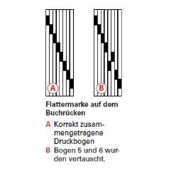 Bei 16- und 32-seitigen Bogen kommen die Seiten 3/4 nur an die Anlage, wenn der erste Falzbruch parallel zu den Druckzeilen verläuft, sonst kommen die Seiten 5/6 an die Anlage