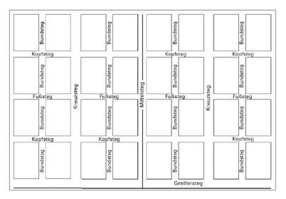 umfasst den Satzspiegel sowie Kopfsteg, Außensteg, Fußsteg und Bundsteg