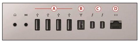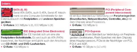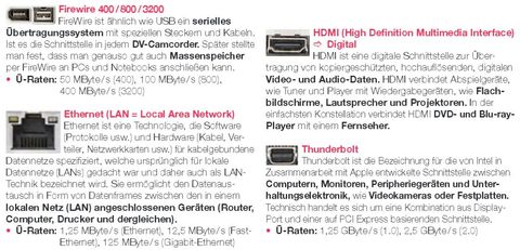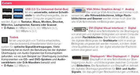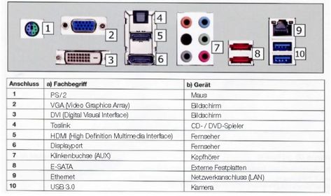 (e)SATAExternal SATA – Festplatten oder Brenner können hier angeschlossen werden USB2.0 / 3.0: universelle Schnittstelle für verschiedene Geräteklassen, z.B. Massenspeicher, Drucker, Smartphones, Kameras, Maus, Tastatur etc. USB-Typ B:Drucker FireWire: für Camcorder, externe Festplatten Ethernet (LAN = Local Area Network)Hauptsächlich Netzwerkanschluss aber auch DSL-Modem oder externer Netzwerkspeicher PS/2Maus, Tastatur