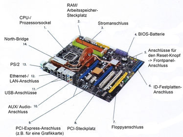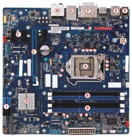 Modell: Intel Desktop Board DH77EBA = Sockel für MikroprozessorB = Slots für Arbeitsspeicher (RAM)C = Slots für PCIe-KartenD = ChipsatzE = USB-SchnittstellenF = HDMI-/DVI-Schnittstelle für MonitorG = RJ45-Schnittstelle für NetzwerkH = Audio-SchnittstelleI =   SATA-Schnittstellen für interne Festplatten