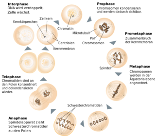 Unter dem Vorgang der Mitose versteht man die einfache Zellkernteilung, bei der am Schluss aus einer Zelle, zwei identische Tochterzellen entstehen. Funktion der Mitose ist dementsprechend die Vermehrung von Zellen. Prophase: Aus 2 identischen Chromatidsträngen bestehenden Chromosomen verkürzen und verdichten sich, indem sie im Zellkern aufgefaltet werden. Dadurch werden sie in eine, für die Mitose nötige, transportfähige Form gebracht. Prometaphase: Kernhülle zerfällt und gibt die Chromosomen frei. Außerdem bilden sich am Rand der Zelle die Spindelapparate aus. Diese bestehen aus Mikrotuboli und sind später für den Transport der Chromatiden zu den Polen wichtig.