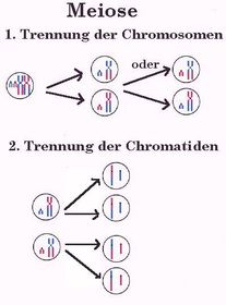 Durch die Meiose kommt es zur Halbierung des Chromosomensatzes. Dies ist bei den Keimzellen (Spermien und Eizellen) nötig, da bei der Befruchtung die Chromosomensätze miteinander verschmelzen. Die Meiose (griech. meiono = vermindern) ist für die Halbierung des diploiden, auf einen haploiden Chromosomensatz bei Keimzellen zuständig. Würde es nicht zu dieser Reduktion kommen, würde sich die Anzahl der Chromosomen bei der Befruchtung immer wieder addieren und es käme zu einer schier unendlichen Zahl an Chromosomensätzen. Diese dabei entstehenden Zygoten wären nicht lebensfähig. Achtung! Die Mitose ist streng von der Meiose zu unterscheiden, bei der es zu einer Reduktion der Chromosomenanzahl kommt.