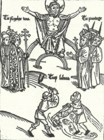 Caption: : Christus weist den drei Ständen ihre Aufgaben zu: Tu supplex ora („du bete demütig!“) zum Klerus, Tu protege („du beschütze!“) zu Kaiser und Fürsten, Tuque labora („und du arbeite!“) zu den Bauern.