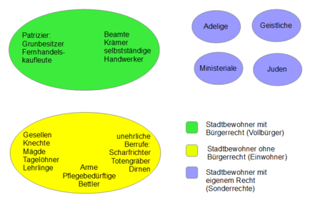 Stadt:-Gründung hauptsächlich wegen wirtschaftl. Interesse-Handel-Stadtrecht -> eigener Rechtsbezirk (besondere Rechte für Reichsstädte)-Nutzen für Bauern durch bessere Erwerbsmöglichkeiten und pers. Freiheit-Bürgerwerdung nur durch Grundbesitz/selbstständiges Handwerk/HandelsgeschäftJuden:-lebten in Ghettos-keine Bürger-Pogromen während er Pestepidemien 1348/50Handel- und Handwerksbetriebe:-organisiert in Zünften-im 12. Jh. nahm der Fernhandel zu-neben Städten in Oberitalien auch Flandern und Hansestädte wichtig-Hanse wurde im Spätmittelalter auch politische Macht in Nord- und Mitteleuropa-nach teilweise gewalttätigen Auseinandersetzungen erreichten die Zünfte Mitbeteiligung an der Stadregierung (14. Jh.)
