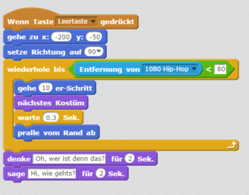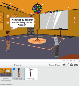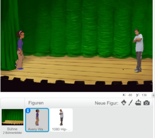 Auf den nächsten Seiten lernst du, wie du durch Kostüme Figuren animieren kannst und wie verschiedene Figuren durch Nachrichten miteinander interagieren können.Wir starten mit einer wirklichen Bühne und zwei Figuren, nämlich "Avery walking" und "1080 Hip -Hop".Avery soll nun auf den Jungen zu gehen.Starte ein Scratch-Projekt mit diesen Figuren.