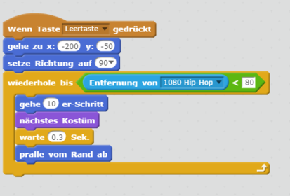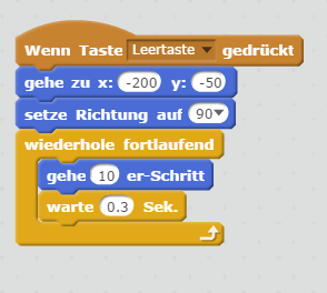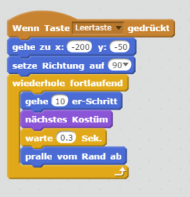 Der Block "pralle vom Rand ab" bewirkt, dass Avery nicht aus dem Bild läuft, sondern eben vom Rand wieder abprallt, sich umdreht und zurück geht.Der Block nächstes Kostüm lässt Avery nun alle 0.3 Sekunden ein neues Kostüm benützen. Da sie diese in den Arm- und Beinstellungen unterscheiden, sieht es aus, also würde Avery tatsächlich gehen.Probiere selbst!