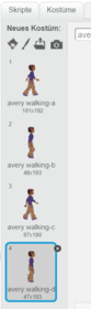 Im Blockbereich finden sich im zweiten Register die Kostüme. Bei Avery sind dort schon 4 Kostüme erstellt. Auch wenn du selbst Figuren zeichnest, kannst du sie duplizieren und so verschiedene Kostüme anlegen. Veränderst du die Kostüme ein wenig z.B. eine andere Farbe, kann man dies anschliessend im Programm anwenden.Lasse die Kostüme von Avery aber so bestehen und lies weiter.