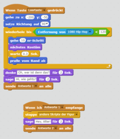 Avery sendet nun eine Nachricht "Antworte" an alle. Auf diese Nachricht können nun andere Figuren oder auch die Bühne reagieren.Wechsle die Figur und aktiviere 1080 Hip-Hop. Er muss nun wissen, was er tun muss, wenn er diese Nachricht empfängt. Falls du dem Jungen auch ein Skript gegeben hast, in welchem er sich bewegt, soll er zuerst stehen bleiben. Das andere Skript soll also gestoppt werden. Anschliessend antwortet er und sendet wieder eine Nachricht (Antworte 2) an alle, auf welche Avery reagieren kann.