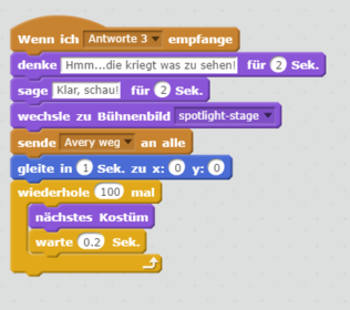 Das Gespräch wird hier weitergeführt. Avery fragt, ob er tanzen kann und sendet wiederum eine Nachricht (Antworte 3).Dann reagiert wieder der Junge. Er denkt sich zuerst etwas, dann antwortet er. Um nun seine Show aufzuführen, ändern wir das Bühnenbild. Auch dieser Block findest du bei den "aussehen"-Blöcken.Hier noch etwas grösser:
