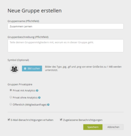 Wenn du der Administrator einer privaten Gruppe bist und möchtest, dass deine Gruppe öffentlich ist (oder umgekehrt), so dass auch andere Nutzer leicht beitreten klnnen, kannst du das ganz leicht in den Gruppeneinstellungen (Bild) einstellen. Beachte bitte, dass der Wechsel von einem Gruppentyp mit Analytics zu einem Typ ohne Analytics ein Vorgang ist, der nicht rückgängig gemacht werden kann und zum Verlust aller vorhandenen Analytics-Daten führt.