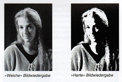 Betrachtet man die Abbildungen, so fällt die unterschiedliche Abstufung der Tonwerte zwischen hellster Vorlagenstelle (Licht) und dunkelster Vorlagenstelle (Tiefe) auf.Dieses mehr oder weniger starke Ansteigen der Grautöne bezeichnet man als Gradation (Stufe, Schritt).Steigen die Tonwerte in kleinen Stufen an, so liegt ein weiches oder kontrastarmes Bild vor, nehmen sie in großen Stufen zu, so spricht man von einem harten oder kontrastreichen Bild. Der Tonwertverlauf eines Bildes wird als Bildgradation beschrieben. Die Gradation sollte schon bei der Kameraaufnahme bzw. beim Scanvorgang beeinflusst und optimiert werden, da nur dort bei der üblichen Datentiefe von 12 bis 16 Bit genug Digitraldaten zur Verfügung stehen. Führt man die Tonwertkorrektur erst im Bildbearbeitungsprogramm durch, steht meist nur noch die Datentiefe von 8 Bit zur Verfügung, so dass ein stufenloser Tonwertverlauf nicht mehr garantiert ist.