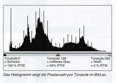 Digitalkameras, Scan- und Bildbearbeitungsprogramme erlauben die Analyse der Tonwertverteilung eines Bildes mitteln "Histogramm". Solch eine Darstellung zeigt bei einem einfarbigen Bild mit einer Datentiefe von 8 Bit = 256 Tonstufen für alle Tonstufen von 0 bis 255 in der y-Richtung die Häufigkeit der Pixel pro Tonstufe an.Die von Programmen benutzte "automatische Vorlagenanalyse" beruht auf der Auswertung des Histogramms zum Zwecke der Lichter- und Tiefeneinstellung sowie der Gradationskorrektur über den gesamten Tonwertbereich.Das abgebildete Histogramm gehört zum "weichen Bild".Die fehlenden Tonstufen in der "Tiefe" (im Histogramm links) und im "Licht" (rechts) weisen auf eine kontrastarme Bildwiedergabe hin.
