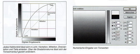 Allgemein lässt sich der zu bearbeitende Tonwertumfang in Teilbereiche gliedern, nämlich in die Lichter, Viertel-, Mittel- und Dreivierteltöne sowie Tiefen oder Schatten (Abbildung Tonwertumfang). Entspricht der Eingabewert (x-Achse) dem Ausgabewert (y-Achse), so wird der Zusammenhang durch die Winkelhalbierende (45°) veranschaulicht.Verändert man die Kurve, so wird der ursprüngliche Tonwertumfang in der Tonwertabstufung verändert und neu umverteilt.Dabei gilt:Wird ein Bildbereich kontrastreicher dargestellt, so geht das auf Kosten des anderen Bildbereichs, der kontrastärmer dargestellt wird!