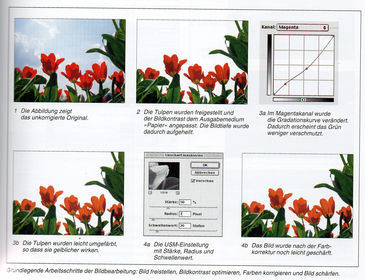 Bildgradation einstellen und farbkorrigieren:Ein Bild soll einerseits in seinem Kontrastumfang dem Ausgabemedium angepasst werden, andererseits kann auch der Tonwertverlauf dazwischen verändert werden. Mit der Gradationskurve kann global oder in den einzelnen Kanälen C, M, Y, K eingegriffen werden. Auch Farbstiche und Farbverschmutzungen werden beseitigt. Letztere rühren daher, dass in einem Farbton die Komplementärfarbe zu stark beteiligt ist. Farbton-, Sättigungs- und Helligkeitskorrekturen können auf das Gesamtbild oder auf ausgewählte Bereiche angewendet werden.Bildteile schärfen:Das Bild muss oder Bildteile müssen am