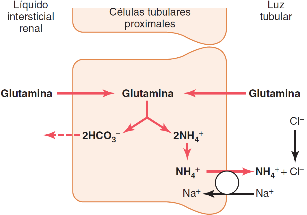 por cada 2 moléculas de NH4 (amoniaco) se producen 2 de HCO3 que son reabsorbidas a la sangre. (acción de la glutamina)