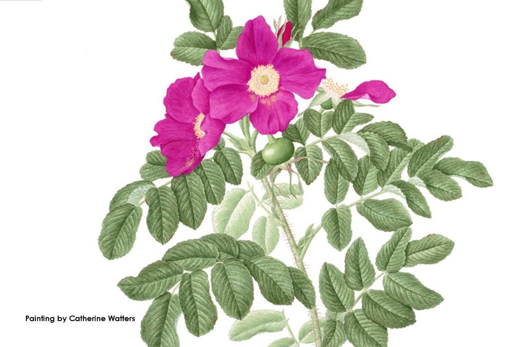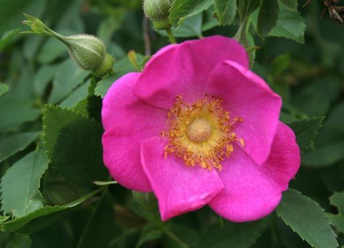 Rosa rugosa is a suckering shrub which develops new plants from the roots and forms dense thickets 1–1.50 m tall with stems densely covered in numerous short, straight prickles 3–10 mm long. The leaves are 8–15 cm long, pinnate with 5–9 leaflets, most often 7, each leaflet 3–4 cm long, with a distinctly corrugated (rugose, hence the species' name) surface. The flowers are pleasantly scented, dark pink to white, 6–9 cm across, with somewhat wrinkled petals; flowering occurs in spring.[1]