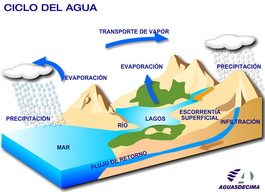 El agua circula entre el océano, el aire, la tierra y la biota, este ciclo también distribuye el calor solar sobre la superficie del planeta