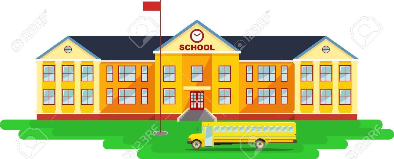 43946317 Edificio De La Escuela Clásica Y Autobús Escolar Aislado En Fondo Blanco (image/jpeg)