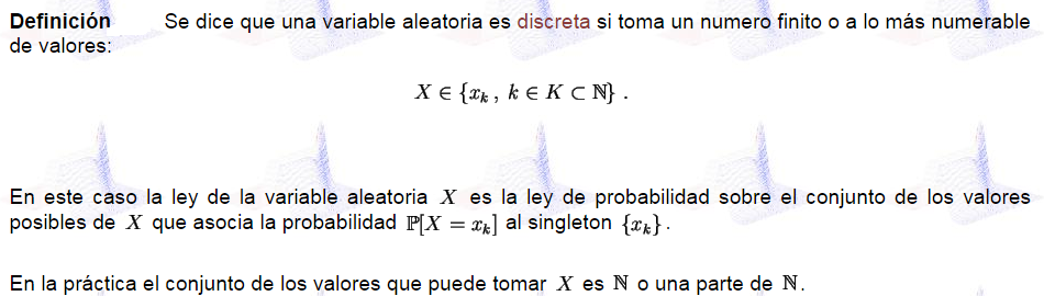 Definición: Se dice que una variable aleatoria es discreta si toma un numero finito o a lo más numerable de valores
