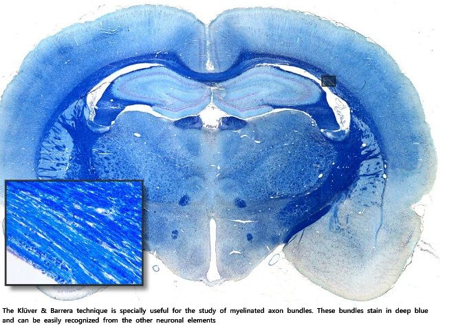 los axones mielínicos se tiñen de color azul intenso. Evidentemente esta técnica se usa