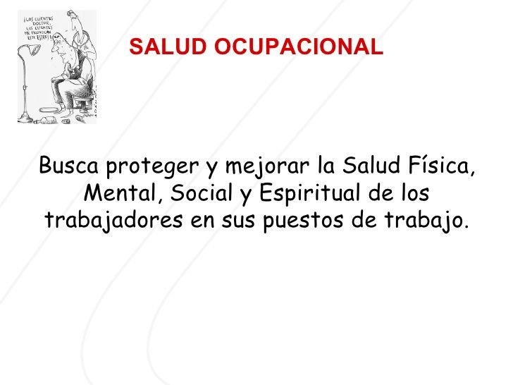 La salud ocupacional es el estado de completo bienestar físico, mental y social y no solamente la