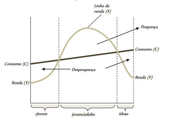 O consumo corrente depende não só da renda corrente, mas também da riqueza adquirida ao longo da vida e também da renda esperada até a aposentadoria.
