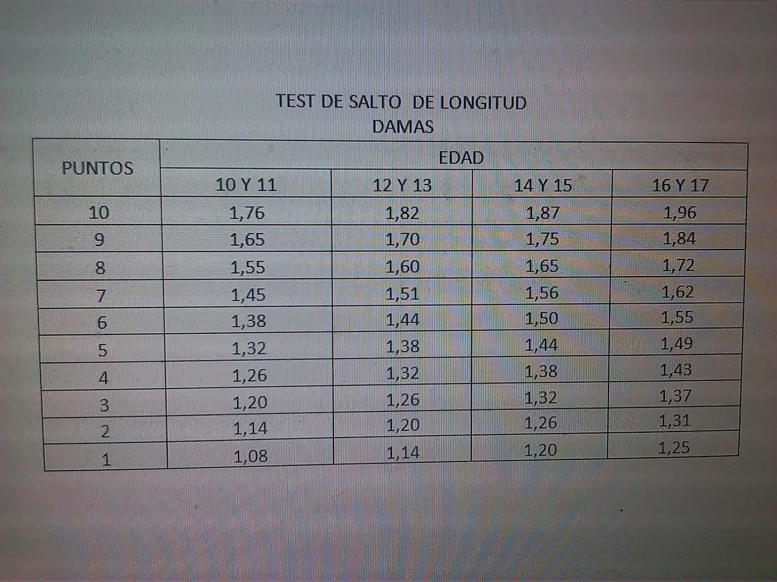 TEST DE SALTO LARGO SIN IMPULSO . SE HACEN TRES REPETICIONES Y SE TIENE EN CUENTA EL SALTO DE MAYOR RECORRIDO