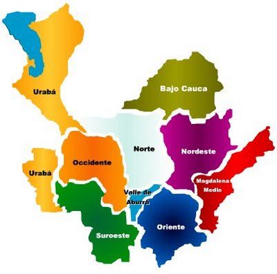 Uraba, Occidente, Suroeste, Norte, Bajo cauca, Nordeste, Oriente, Magdalena medio