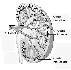 arteriolas (interlobar, arcuata, interlobular y aferente) antes de entrar en el glomérulo