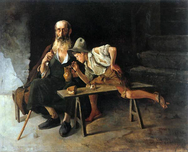 Tiene mucha confianza con el Lazarillo y cree todo lo que él le dice, pero aún así le deja pasar hambre.