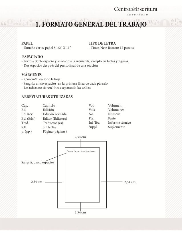 2,54 cm/1 en todo la hoja- Sangría: cinco espacios en la primera línea de cada párrafo- Las tablas no tienen líneas separando las celdas
