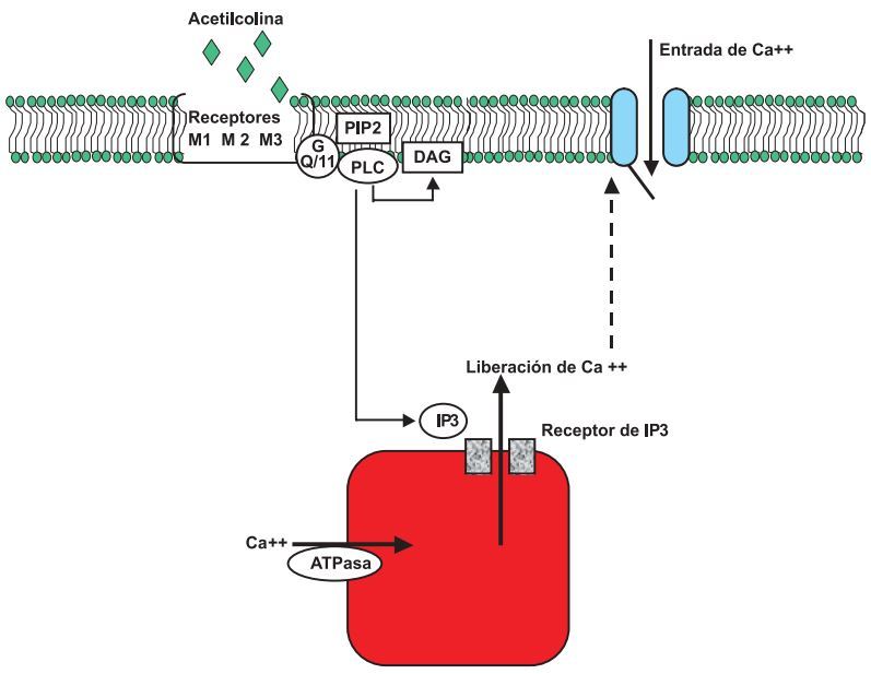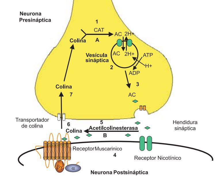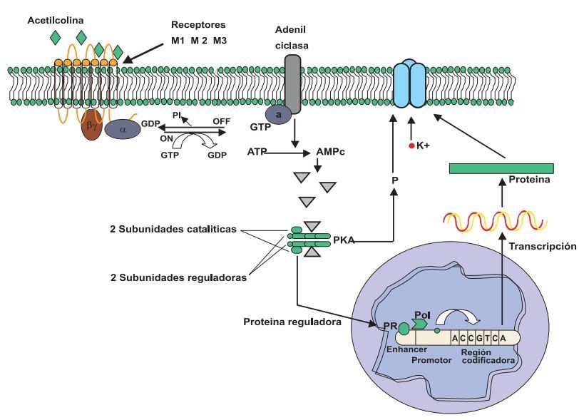 Esquema mental sobre el mecanismo de acción de la acetilcolina a diferentes niveles.