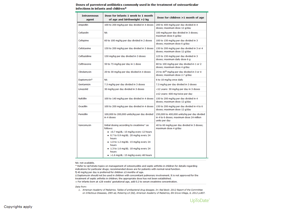 La duración total del tratamiento oscila entre 2 a 3 semanas, entre IV y oral, y en concordancia con la respuesta de los reactantes de fase aguda.