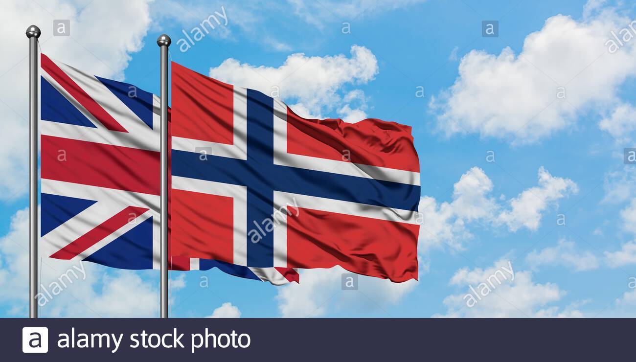 Reino Unido Y Noruega Ondear La Bandera En El Viento Contra Un Blanco Azul Cielo Nublado Juntos Concepto De Diplomacia Y Relaciones Internacionales 2adr0p9 (image/jpeg)
