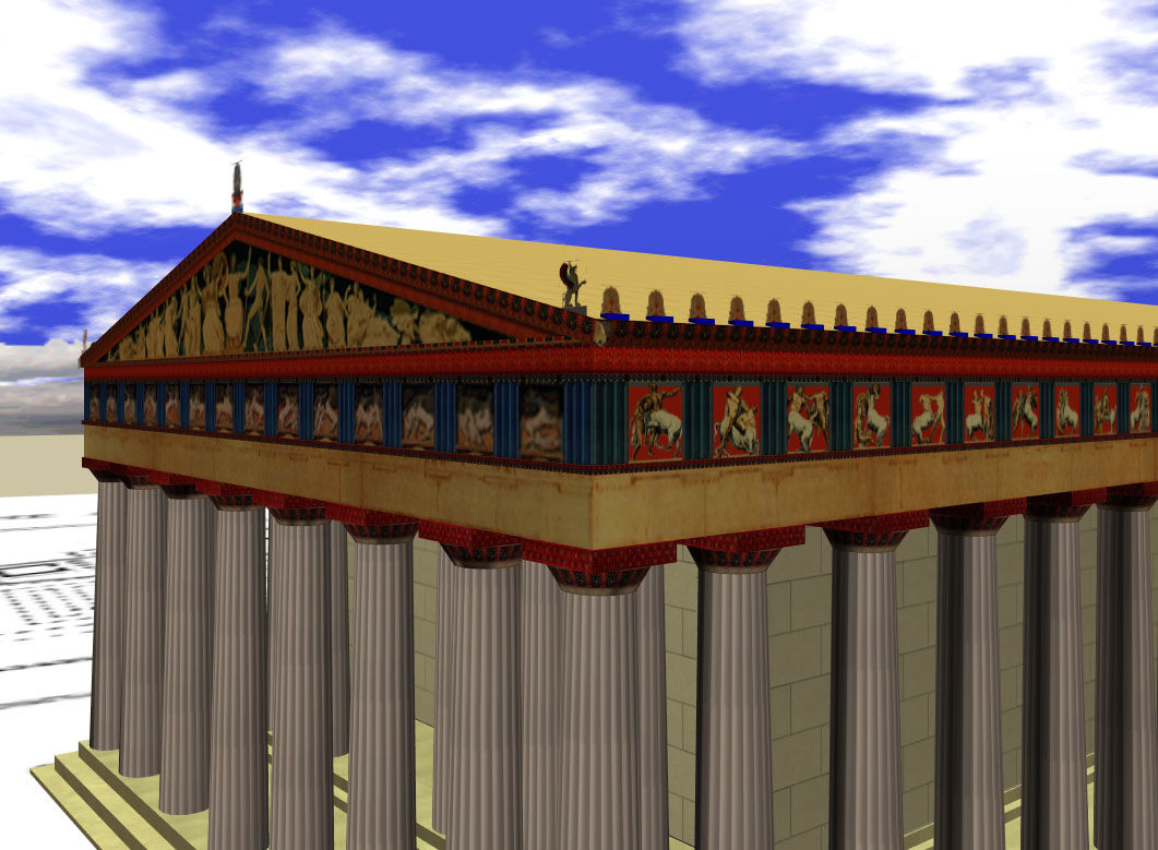 Koloreak galdu dira. Brontzezko eskultura gehienak galdu egin dira ere, baina erromatarrek eginiko kopiei esker badakigu nolakoak ziren