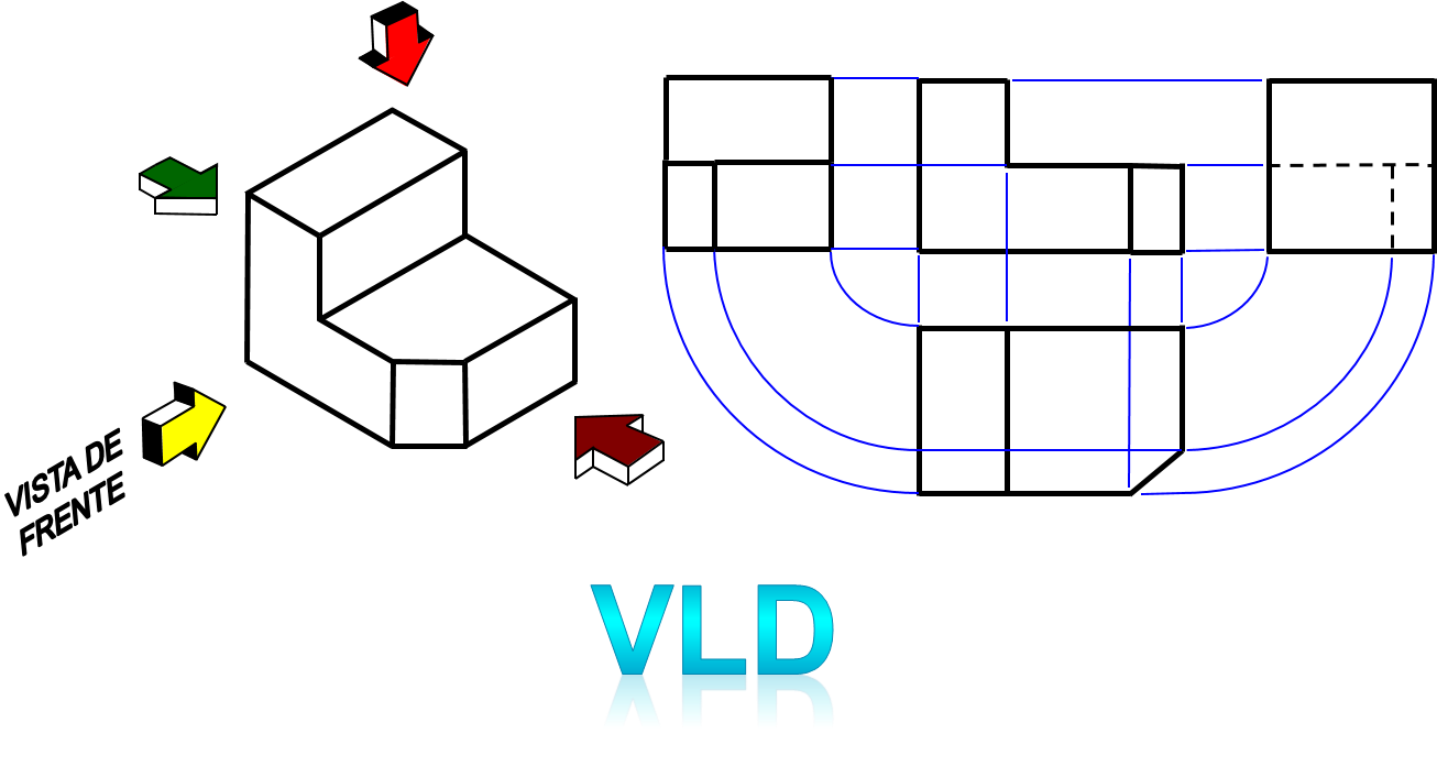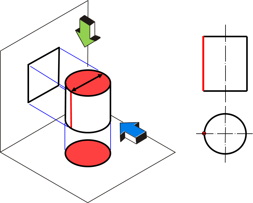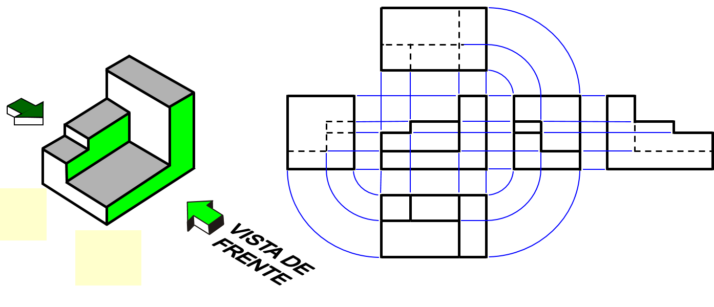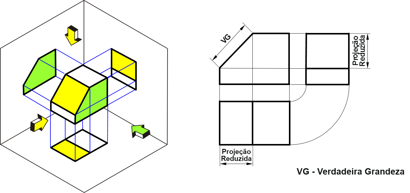 Projeçoes ortogonais de elementos paralelos, inclinados, oblíquos e curvos aos planos de projeção.