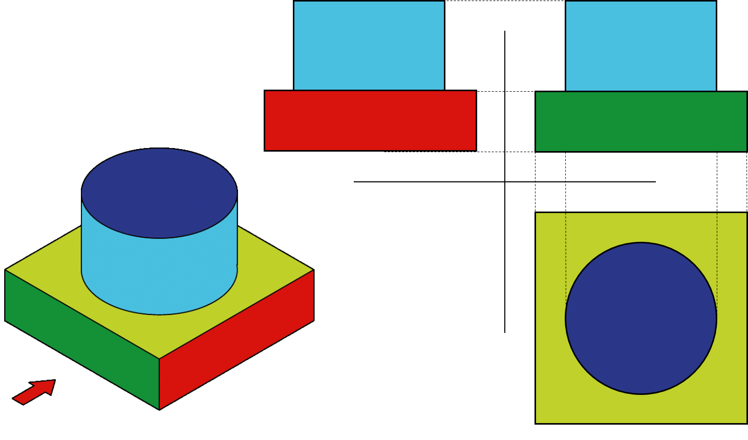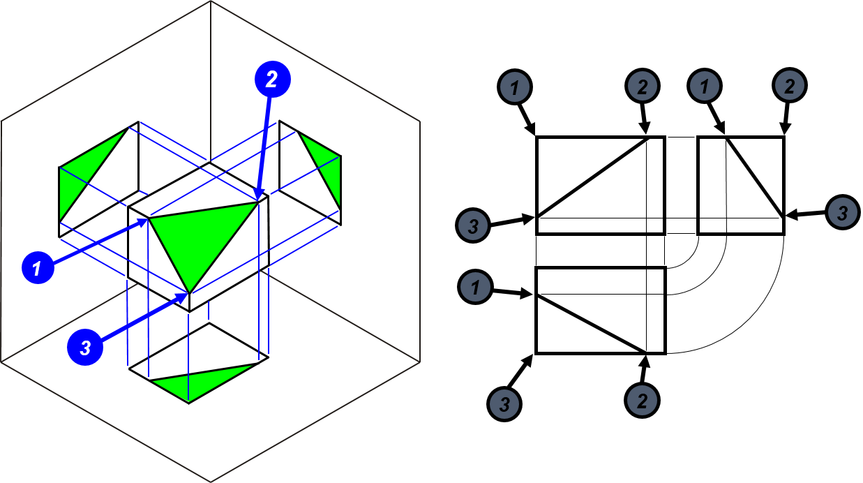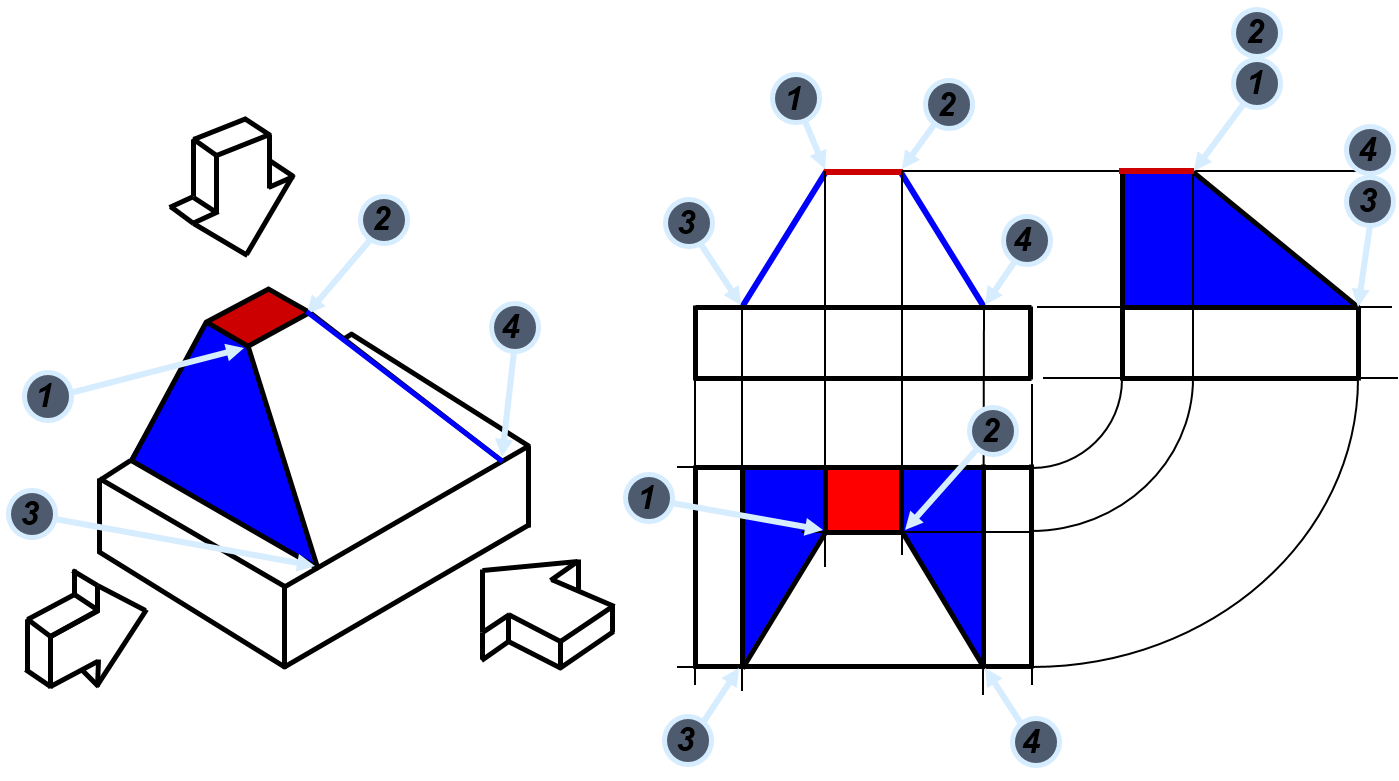 Projeçoes ortogonais de elementos paralelos, inclinados, oblíquos e curvos aos planos de projeção.