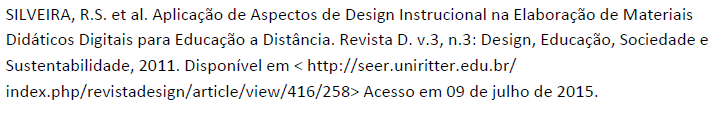 SILVEIRA, R.S. et al. Aplicação de Aspectos de Design Instrucional na Elaboração de Materiais Didáticos Digitais para Educação a Distância. Revista D. v.3, n.3: Design, Educação, Sociedade e Sustentabilidade, 2011. Disponível em < http://seer.uniritter.edu.br/ index.php/revistadesign/article/view/416/258> Acesso em 09 de julho de 2015.